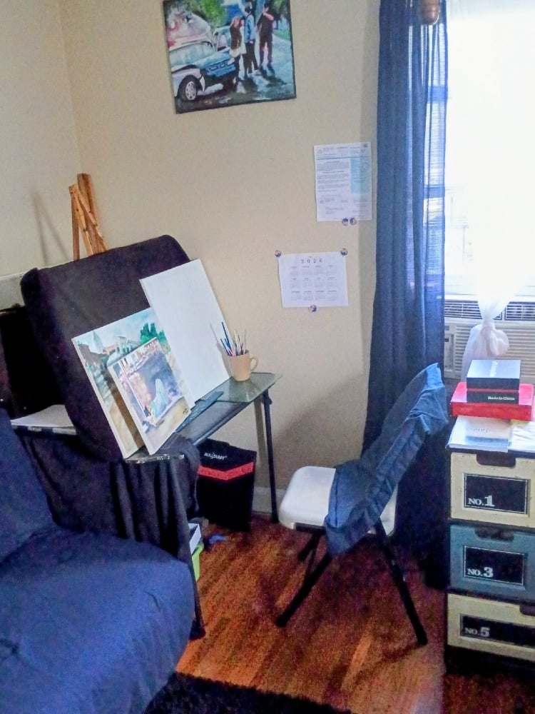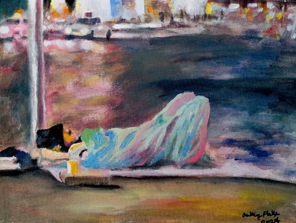 In "Night Watch," the artist employs loose, emotive brushwork to explore the textures of life on the street. The composition is defined by its use of color—soft pinks, deep blues, and warm ambers reflect off the pavement, creating a sense of movement in the background that highlights the stillness of the foreground.The figure, draped in layers of fabric, becomes a study of form and shadow. This piece invites the viewer to pause and reflect on the hidden narratives within our cities, find beauty in the overlooked, and recognize the shared human experience in every corner of the world.