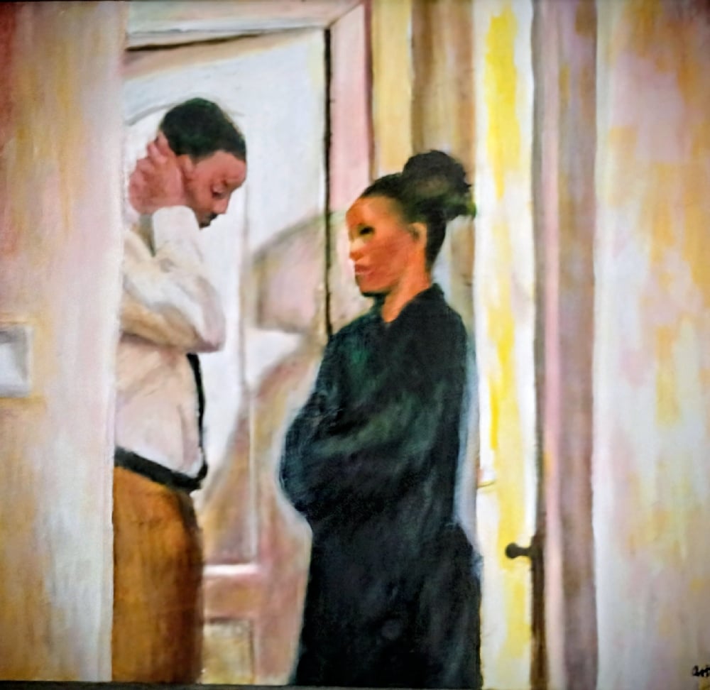 * The Vertical Divide: The sharp line of the doorframe physically separates the two figures, mirroring the emotional chasm that has opened between them the moment the words were spoken.